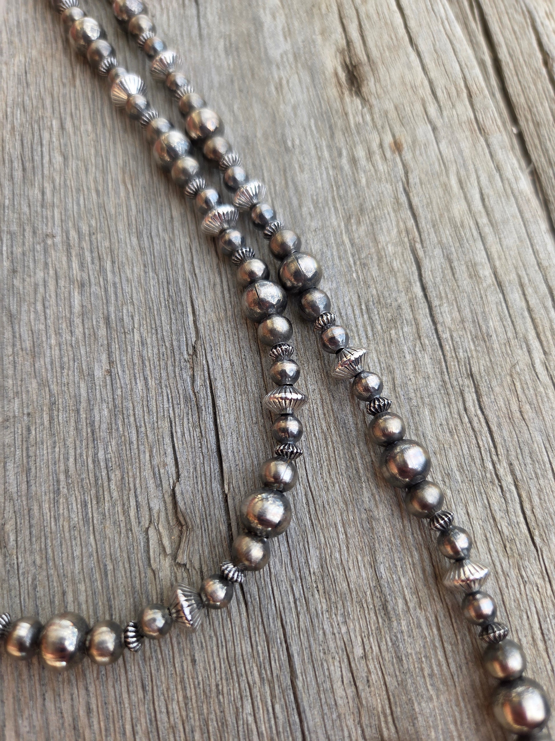 We hand make this jewelry line with beads of German silver, a specialty white bronze alloy containing a blend of metals that boasts excellent tarnish resistance and durability. Our Navajo artists antique & hand polish them to create perfect Navajo pearls. You can see the beauty and handwork- no two pearls are exactly alike!"