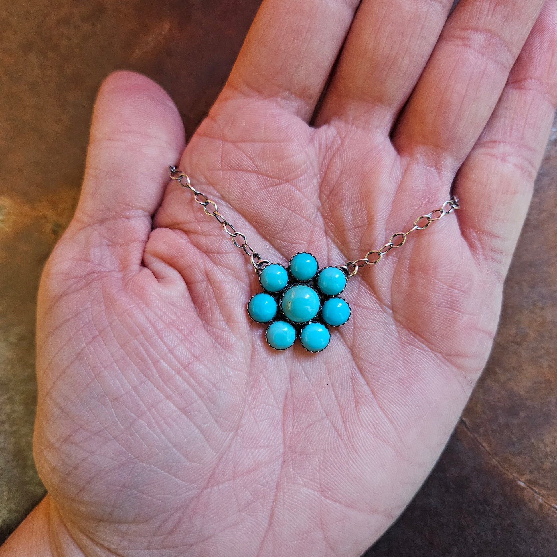 This cluster flower has Kingman Turquoise stones and is on an 18" Sterling Silver chain.